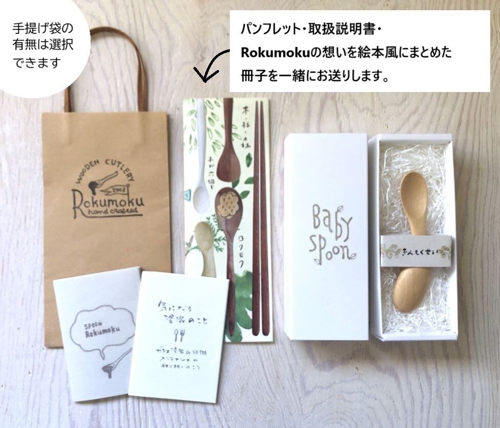 商品と一緒に[パンフレット・取扱説明書・Rokumokuの想いを絵本風にまとめた冊子]をお送りします。※簡易包装も選択できます。
