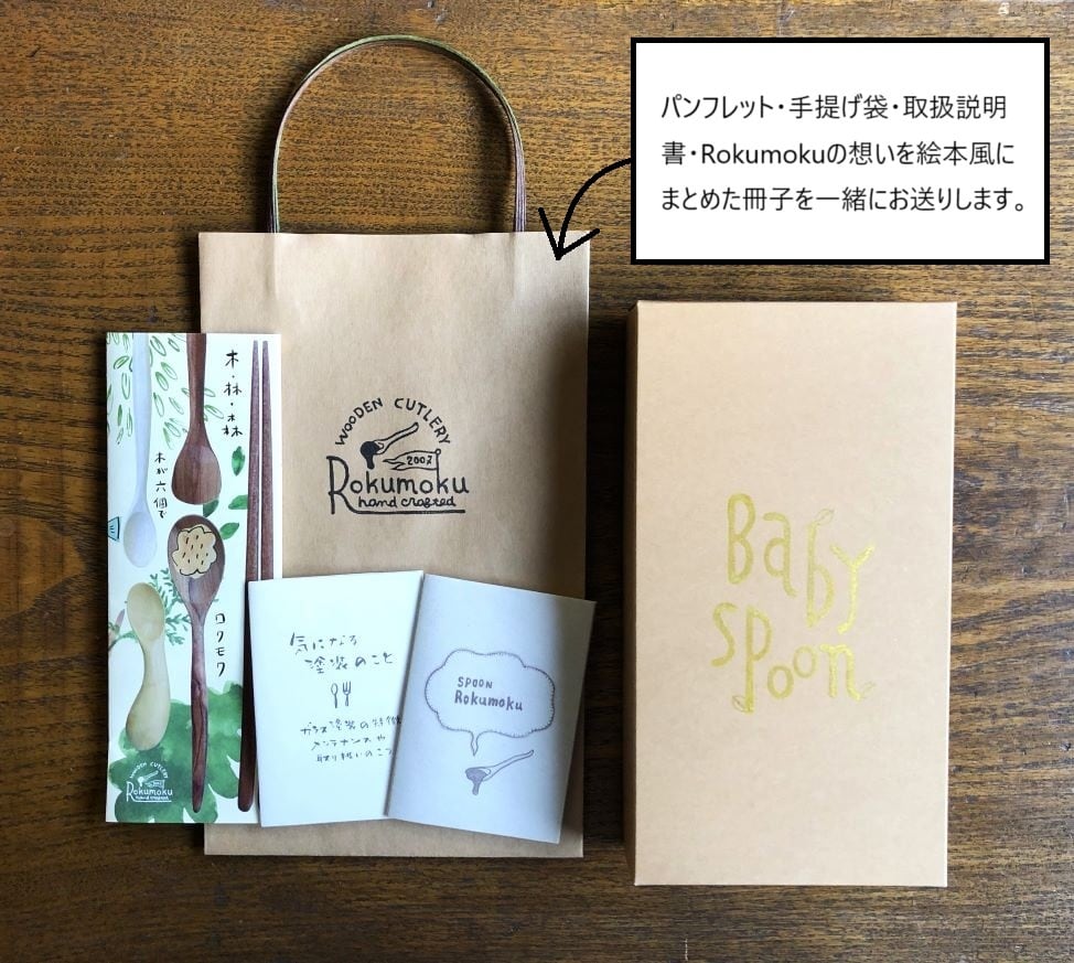 商品と一緒に[パンフレット取扱説明書・Rokumokuの想いを絵本風にまとめた冊子]をお送りします。※簡易包装も選択できます。